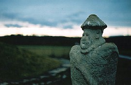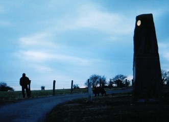 bemalten Menhir bei, dessen an der Oberseite angebrachte Goldscheibe