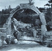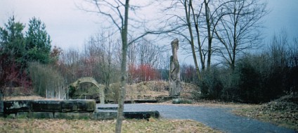 Was meint Sailer, wenn er das Mahnmal eine "archäologische Ausgrabungsstätte" nennt? Nähert man sich dem Bereich, so sieht er von weitem wie ein Kult- oder Totenbezirk aus. Eine Steinstele ragt wie ein Menhir empor und ein Torbogen scheint in dunkle und verborgene Regionen zu führen. |