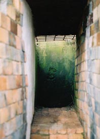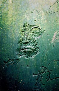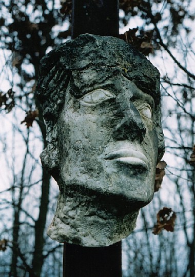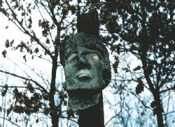 Ein Kopf steckt auf einem Pfahl vor ein paar kahlen Bäumen. Betrachtet man ihn näher, fallen halb heroische, halb schmerzverzerrte Züge auf. Besonders im Winter, wenn das Laub spärlich ist, wirkt die Stätte wie ein Geisterhaus, in dem unerlöste Seelen umherirren. Wenige Meter weiter führt ein Schacht in eine schmutzige Ecke: Was auf den ersten Blick wie ein Pissoir oder Kellereingang aussieht, entpuppt sich als aufregender imaginativer Ort, der ins Reich der Dämonen zu führen scheint. |
